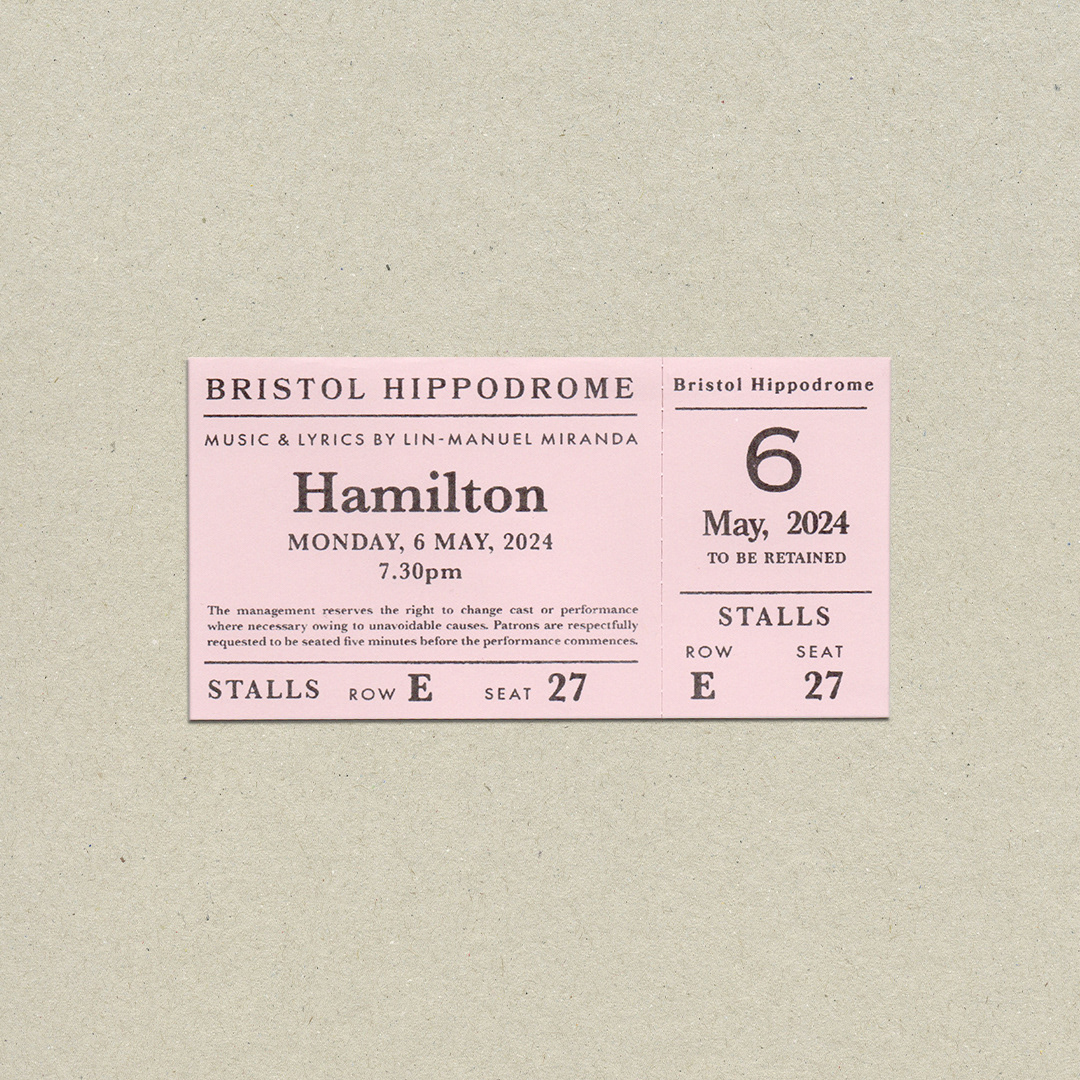 I surprised my husband on his birthday with tickets to Hamilton in Bristol. I decided to replicate and decided to gift him a recreated vintage ticket (rather than forwarding the ticket email confirmation…).